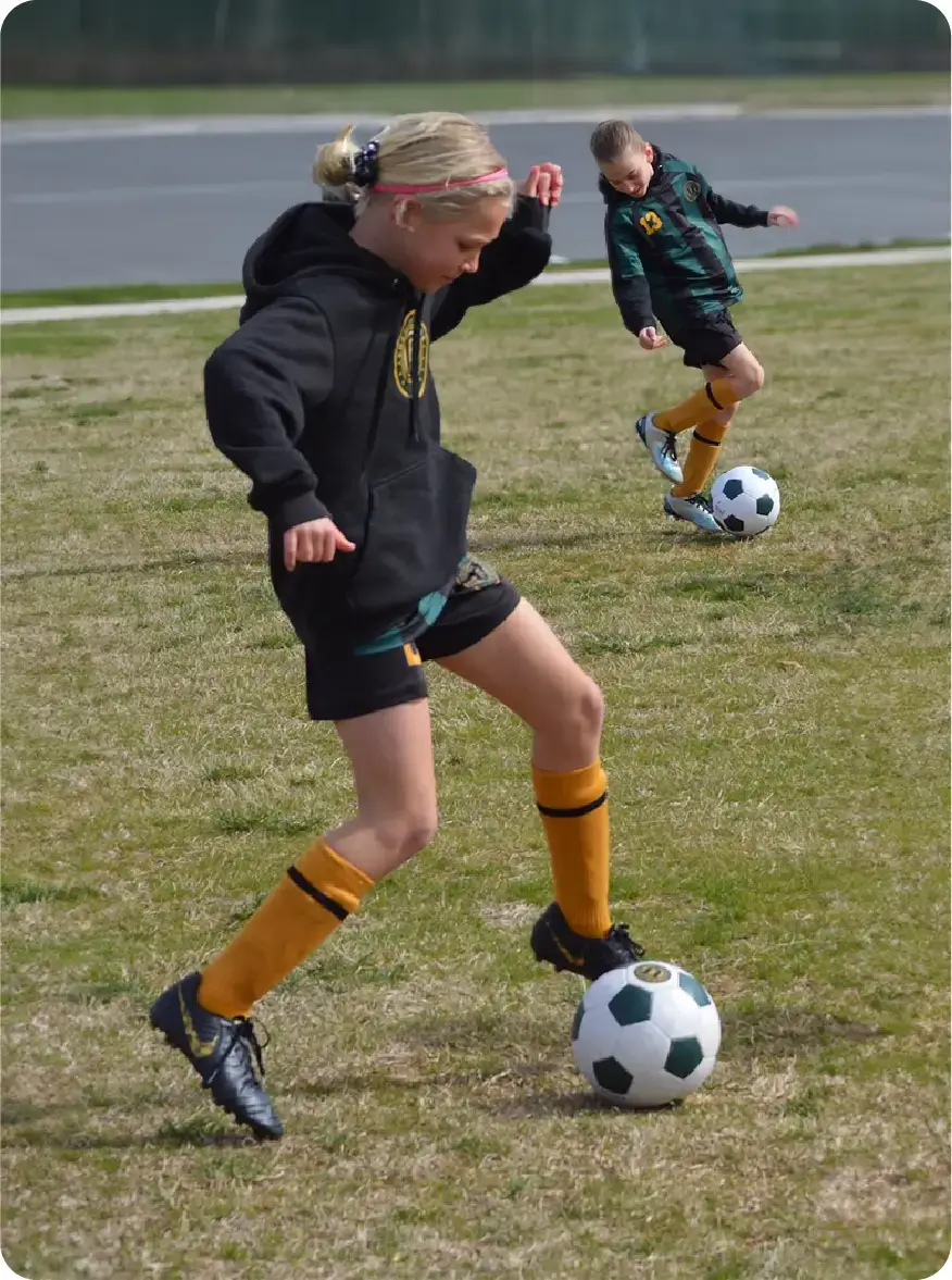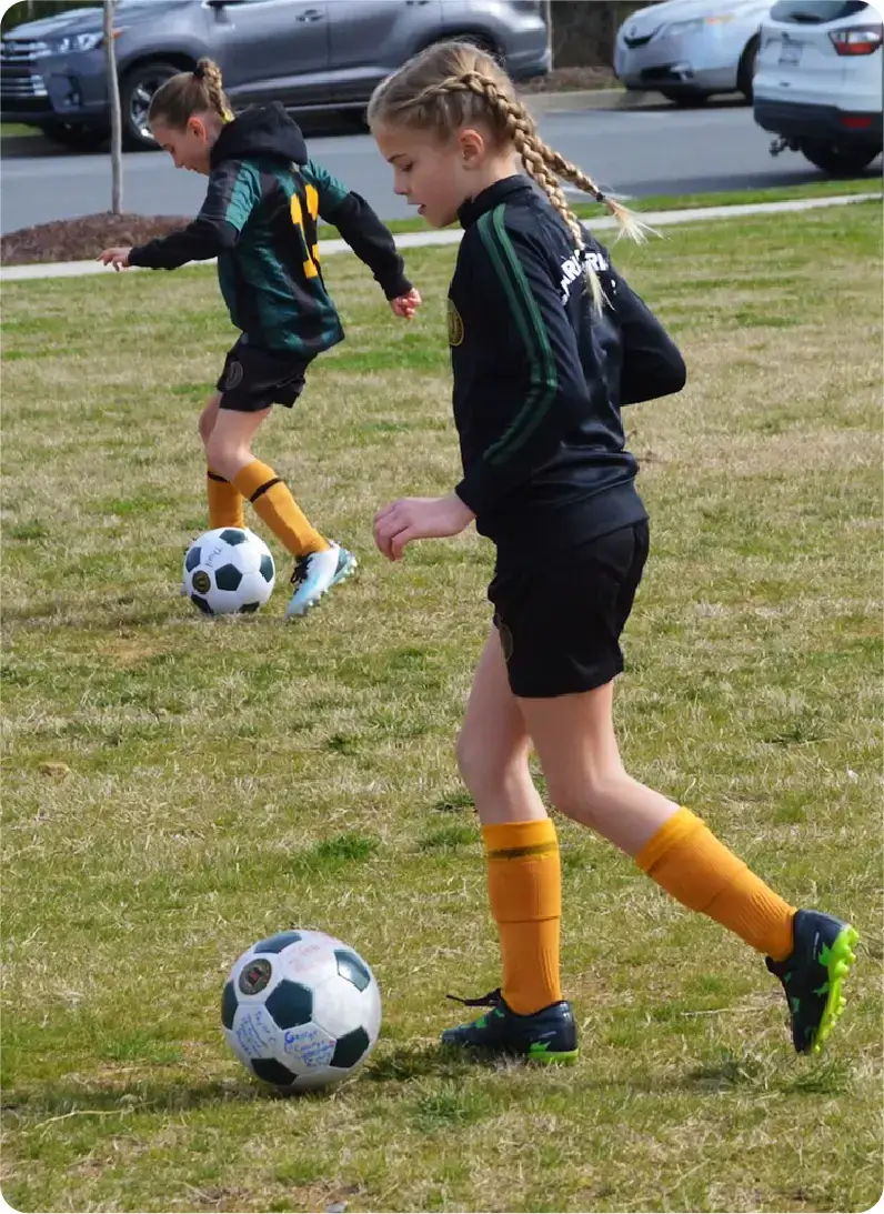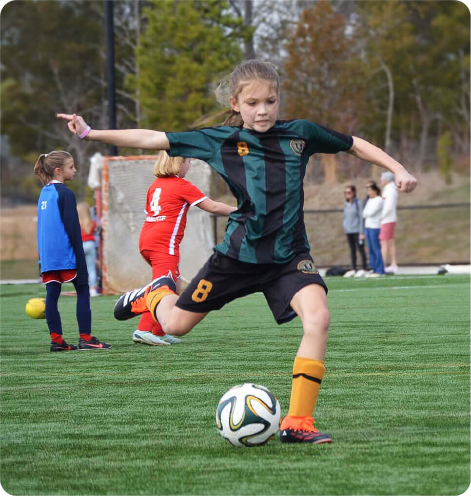 Our U11 soccer player demonstrated precise ball-shooting skills. She leaned perfectly into the kick, her non-kicking foot was planted firmly beside the ball for balance and accuracy, and her eyes were fixed on the target.